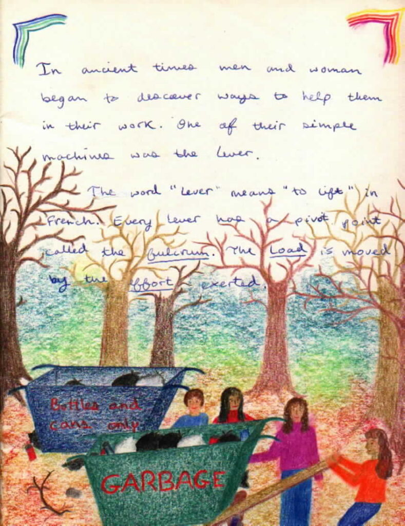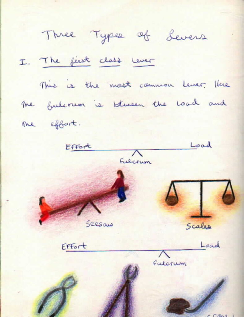 Una lezione nella scuola Steier-Waldorf non è completa a meno che non ci sia tempo per gli studenti di svolgere il loro proprio lavoro accademico, artistico e pratico. Questo è particolarmente vero nelle lezioni di Fisica, poiché la maggior parte del lavoro scritto viene redatto dagli studenti stessi. L’insegnante può aiutare gli studenti a formulare con chiarezza un concetto, ma quel concetto viene individualizzato e riempito di maggiore significato quando gli studenti scrivono delle loro esperienze e idee con le loro proprie parole.